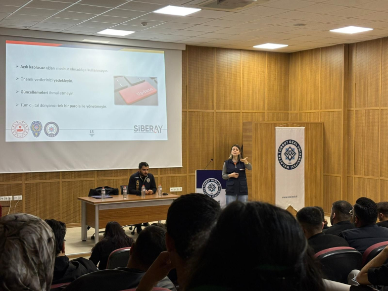 Program kapsamında, İl Emniyet Müdürlüğü Siberay Programı çerçevesinde görev yapan polis memurları Elçin BAŞAR KARAKURT ve Enes UĞUR tarafından; siber suç türleri, güvenli internet kullanımı, sosyal medya güvenliği ve kişisel verilerin korunması konularında önemli bilgiler paylaşıldı. Özellikle banka kartı dolandırıcılığı, yasa dışı bahis siteleri ve oltalama (phishing) saldırıları gibi güncel tehditler üzerinde durularak, bu risklerden korunma yolları detaylı şekilde ele alındı.